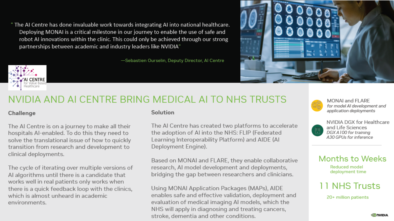 MONAI được tích hợp với các siêu máy tính đám mây lớn, cho phép xử lý và chia sẻ dữ liệu được tối ưu hóa trong một môi trường duy nhất. XPANDX Parabricks có sẵn trên tất cả các dịch vụ đám mây và các nền tảng đám mây dành riêng cho bộ gen, chẳng hạn như nền tảng đám mây Terra, có hơn 25.000 người dùng.