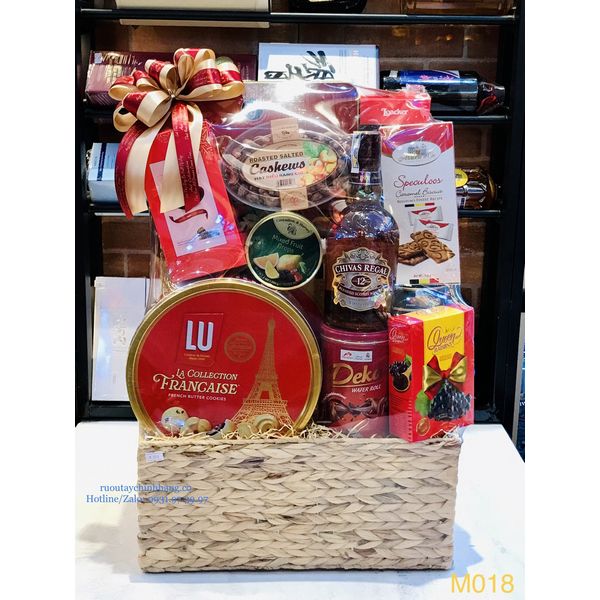M018 - Giỏ quà đan lát thủ công cao cấp Tết 2022, rượu Chivas 12 cao cấp Chính hãng